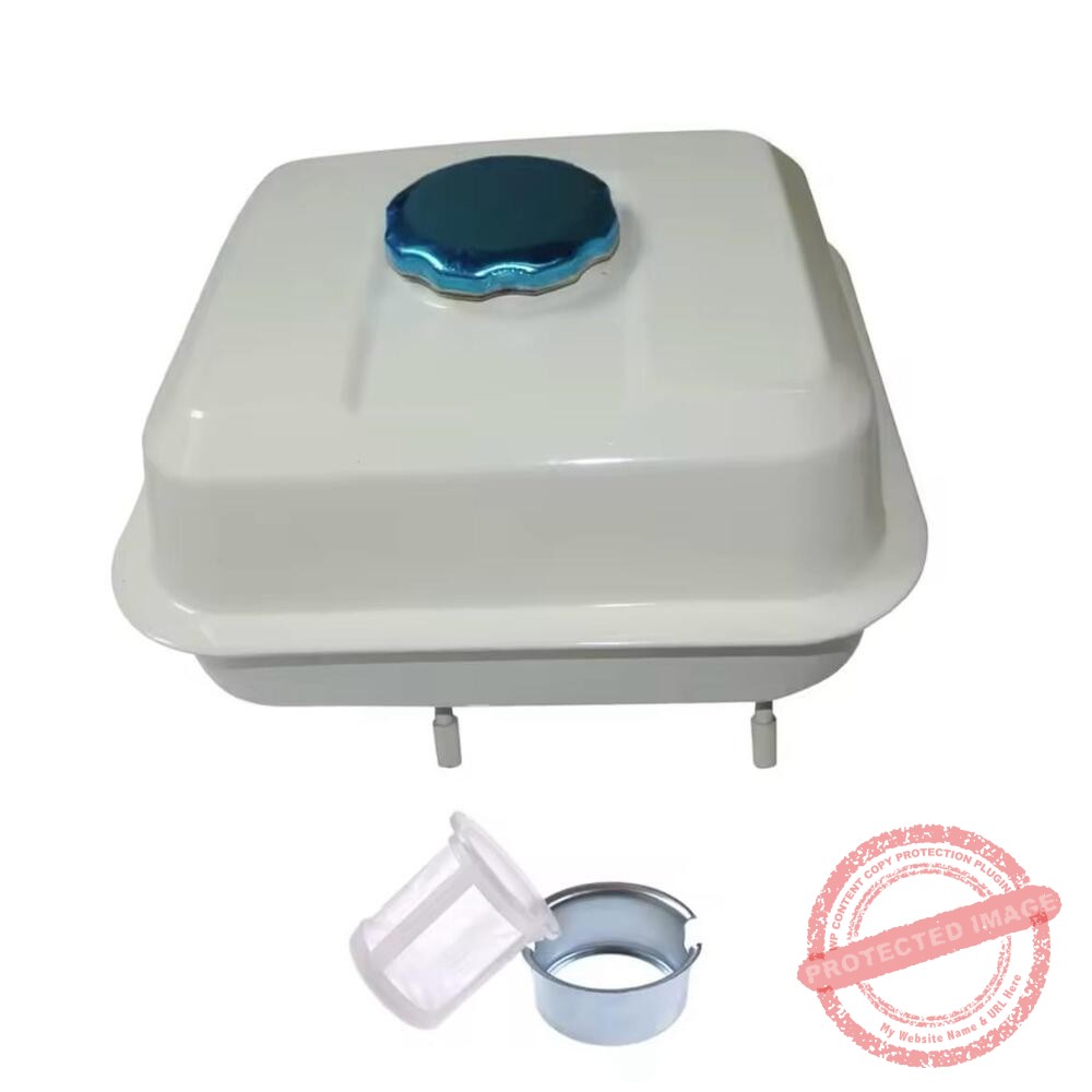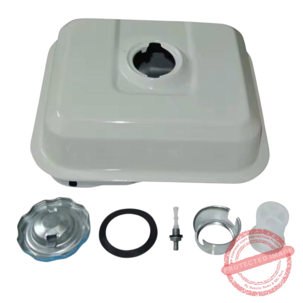 Метален резервоар за гориво, съвместим с голяма част от мотофрези, снегорини, бензинови водни помпи и други машини, с двигатели GX140, GX160, GX200 (5 до 7 конски сили), предлагани на пазара. В комплекта са включени: метална капачка, филтър за отцеждане на мръсотия, щуцер за маркуч. Част от марки, подходящи за този модел: Gardenia, Raider, Premium и други.